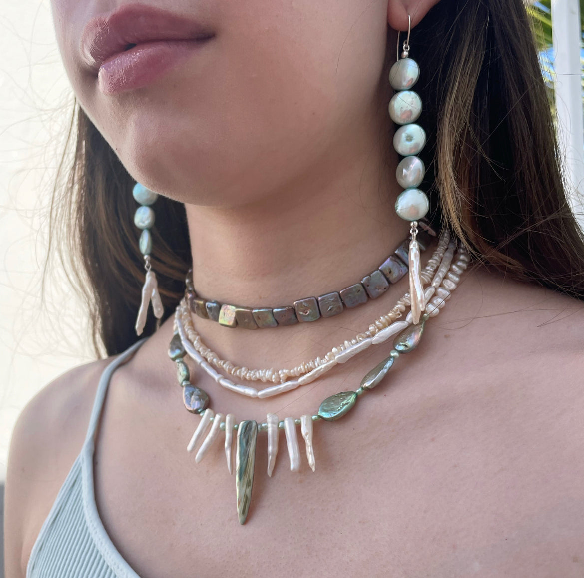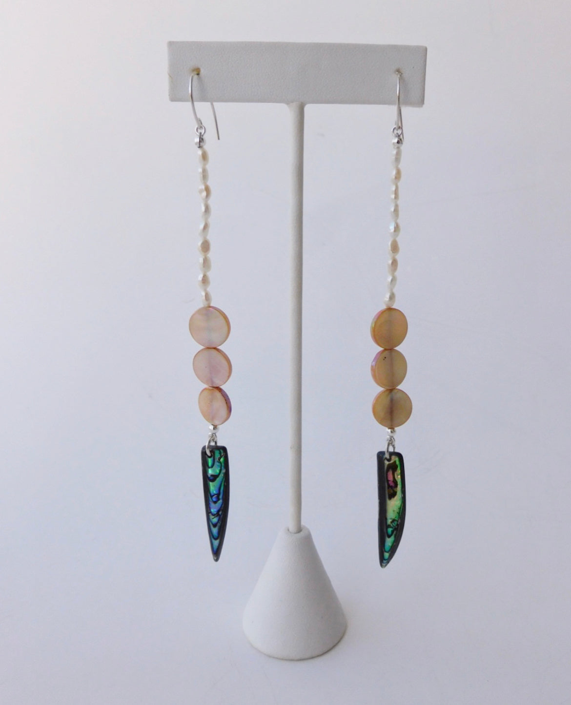 White Seed Pearl, Peach Shells and Abalone Shell Earrings